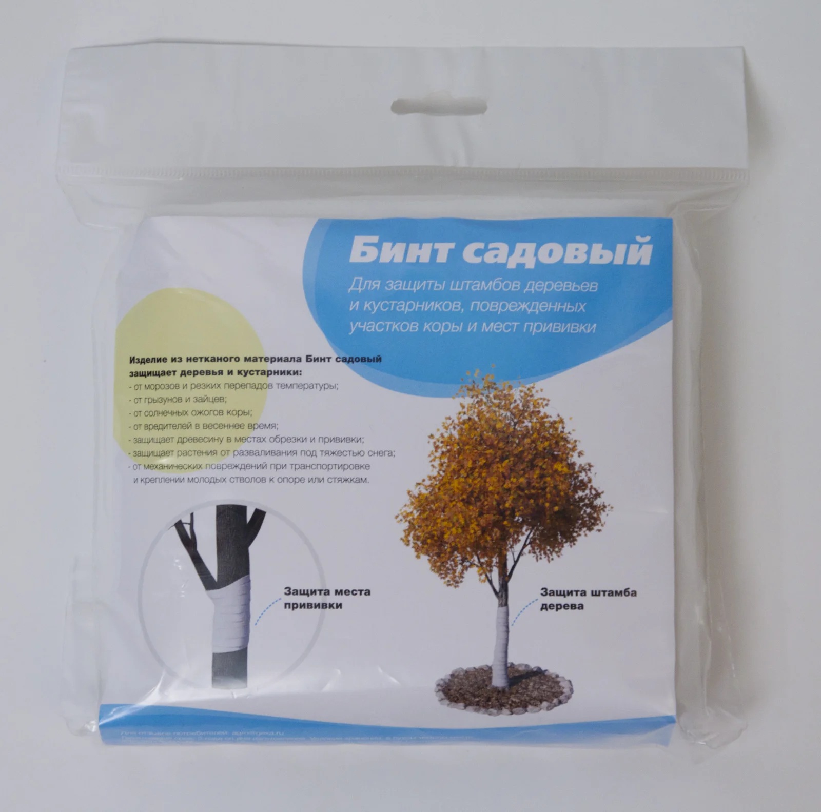 Бинт садовый - эффективный способ защиты стволов и веток растений от проблем. Производится из 100 % полипропилена. Данный бинт можно использовать вместо побелки в качестве защиты от вредителей весной, от заморозков и резких перепадов температур. А также в местах обрезки растений или прививки. Бинт износоустойчив. Его структура хорошо пропускает влагу и воздух, имеет ультрафиолетовый стабилизатор.