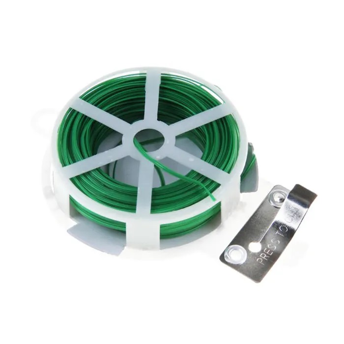 Проволока стальная в оплетке ПВХ на катушке со встроенным резаком. Прочная и гибкая. Предназначена для подвязки растений, связывания сучьев, завязывания мешков и пакетов, скручивания проводов и других целей.