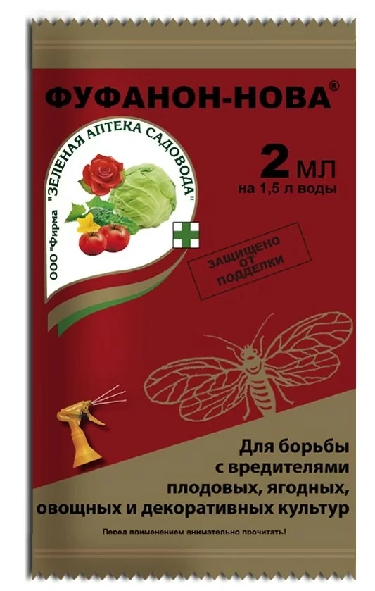 Средство «Фуфанон-нова» обеспечивает эффективную защиту от всех насекомых вредителей, включая тлю, клещей, моль и трипсы. Препарат можно применять для обработки овощных, цветочных, ягодных и овощных культур. «Фунанон-нова» действует очень быстро, обладает низкой токсичностью и легко разрушается в окружающей среде, не загрязняя почву. Препарат не опасен для растений, возможно проведение нескольких обработок в течение одного сезона.