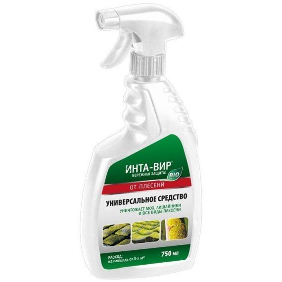 Средство Инта Вир - эффективное средство, которое поможет справиться с такими болезнями у растений как, мох, плесень и лишайники. Средство подавляет размножение разных возбудителей грибковых и бактериальных болезней. Использование способствует уничтожению плесени и мха с натурального и искусственного камня, деревянных покрытий, плитки, стекла, керамики и других материалов, для обработки садовых фигур и памятников.