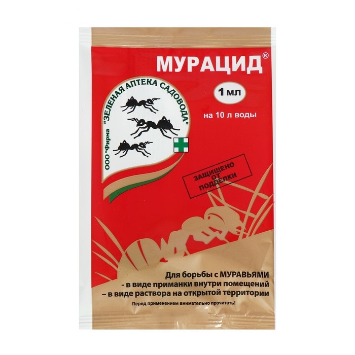 Препарат применяется для уничтожения черных садовых муравьев в отмосках домов, на дорожках, в муравейниках на участках и т.д. Места скопления муравьев и пути их передвижения поливают раствором Мурацида.Мурацид обладает сильным контактным и кишечным действием.Гибель муравьев наступает в течение 2-4 дней после применения. Длительность защитного действия препарата 2-3 месяца.