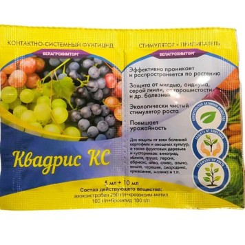 Квадрис КС эффективен против милдью (ложная мучнистая роса), серой гнили, оидиума (мучнистая роса), горошистости и других заболеваний винограда, яблони, груш, персика, абрикос, слив, черешни, вишни, крыжовника, малины, смородины, а также овощных культур.