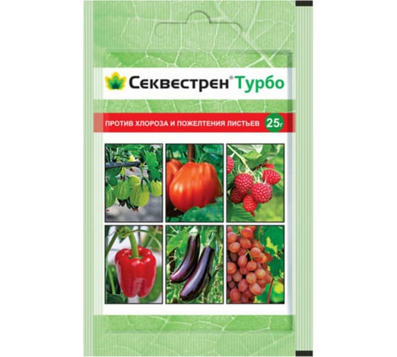 Минеральное удобрение Ваше Хозяйство Секвестрен Турбо 25 г 4680028943846 – азотное удобрения для подкормки всех видов культур. Препарат позволяет восполнить дефицит железа у овощных, плодово-ягодных культур и винограда. Помогает справиться с пожелтением листьев и хлорозом. Средство подходит как для корневой, так и внекорневой подкормки.