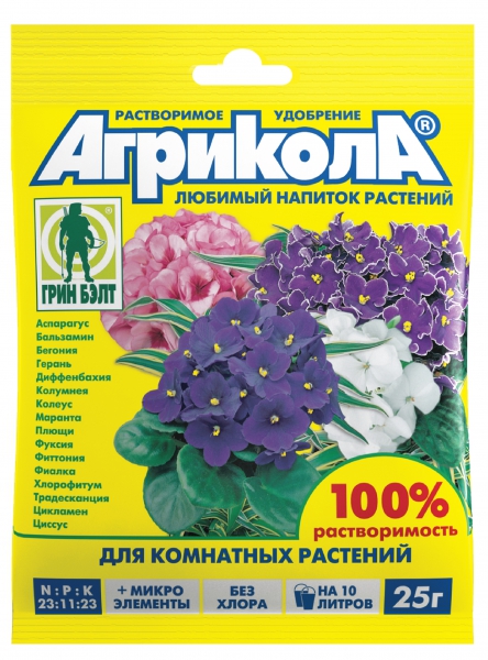 Агрикола для комнатных растенийСостав: (NPK 23:11:23+микроэлементы)Пакет 25 г.Содержат полный комплекс макро- и микроэлементов, необходимый для получения максимальных результатов. Очень экономичны. Норма расхода удобрения составляет 2-2,5 г на 1 л воды. Срок годности сухих удобрений неограничен!