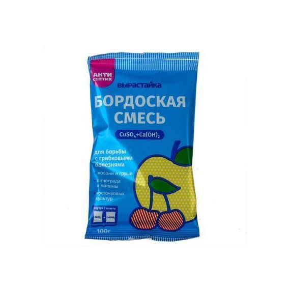 Плодово-ягодные культуры подвержены грибковым заражениям. Для предотвращения и борьбы с грибковыми болезнями хорошо зарекомендовала себя Бордоская смесь Вырастайка. Это многофункциональное антисептическое средство, которое включает в себя медный купорос и гашеную известь – внутри 2 пакета. Средство эффективно для яблонь и груш, малины и винограда, косточковых культур.