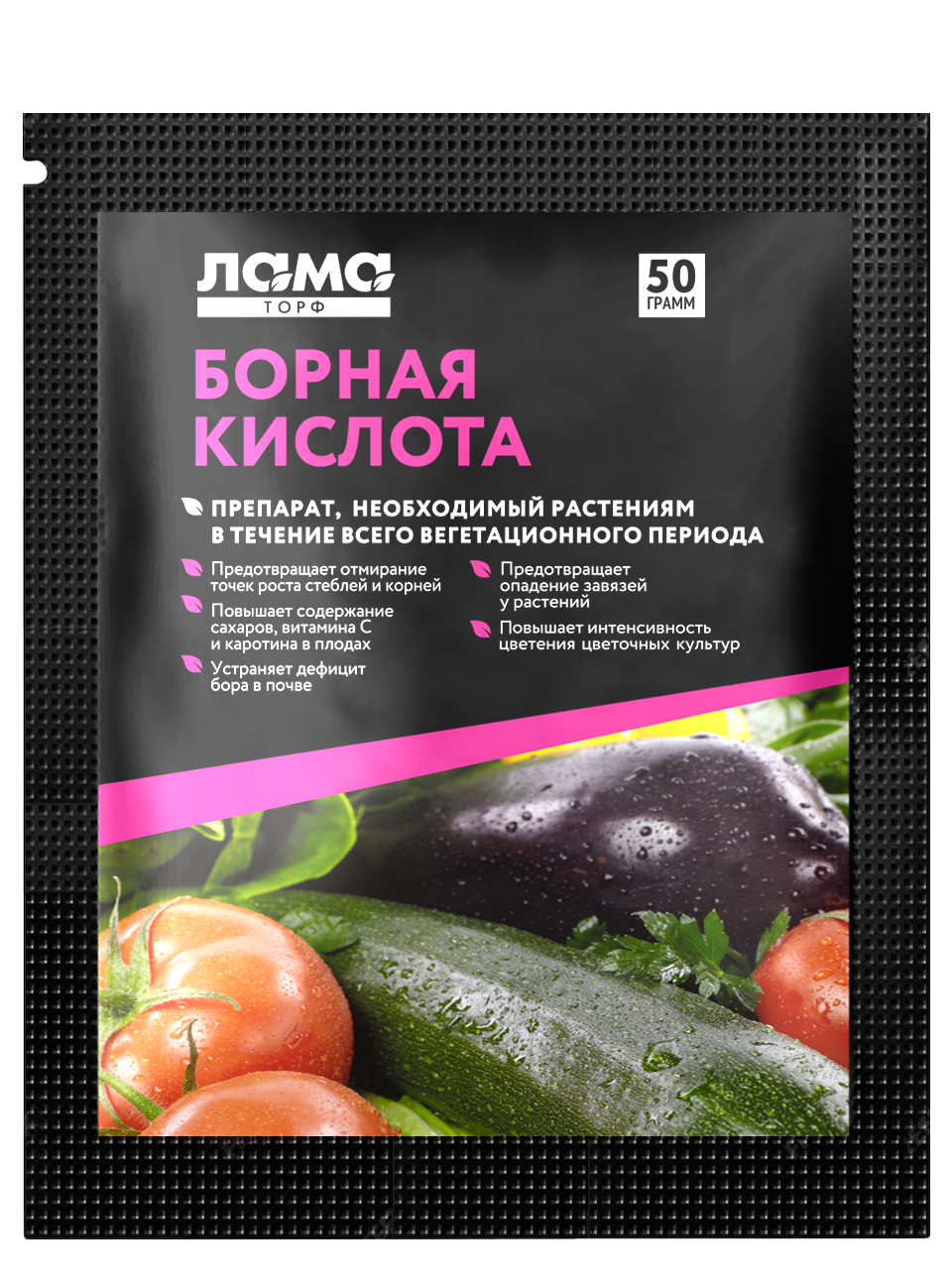Борная кислота это универсальное микроудобрение для плодовых, овощных, ягодных и цветочных культур, применяемое при дефиците бора в почве. Бор оказываеь большое влияние на синтез углеводов, их превращение и передвижение в растениях, формирование репродуктивных органов, оплодотворение, рост корневой системы, окислительно-восстановительные процессы, белковый и нуклеиновый обмен, на синтез и передвижение стимуляторов роста. Поглощение растениями бора увеличивает потребление других питательных веществ. При недостатке бора замедляется рост растений, отмирают точки роста побегов и корней, не раскрываются бутоны, отпадают цветки, появляются трещины, органы растений чернеют и приобретают неправильную форму. Борная кислота содержит микроэлемент бор, необходимый растениям в течение всего вегетационного периода.