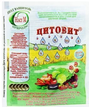 ЦИТОВИТ - Питательный раствор, предназначен для замачивания семян и подкормки любых растений (опрыскивание и полив). Усваивается без потерь. Увеличивает запас жизненных сил и выносливость растений в впериод вегетации и при перезимовке. Ускоряет прорастание семян, рост и развитие растений, повышает устойчивость к неблагоприятным условиям : болезням паразитарного и непаразитарного характера, различным пятнистостям листьев, "розеточность" плодовых, гнили и др. болезни. Предотвращает отмирание точек роста, снижает опадение завязи.