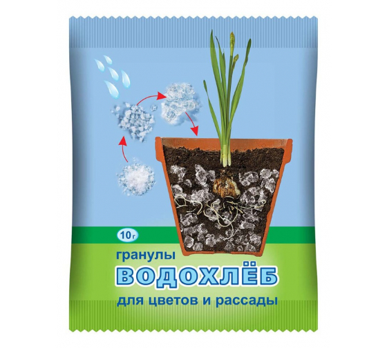 Водохлеб для цветов и рассады. Водохлеб гранулы - гранулированный полимер акриламида. Применяется при выращивании комнатных растений, рассады, а также в открытом и закрытом грунте для улучшения водно-воздушного баланса почвы, сокращения числа поливов, улучшения состояния растений и повышения урожайности. При внесении в почву биологически и экологически безопасен, не выделяет вредных веществ, не угнетает растения и полезную микрофлору. Водохлеб способен поглощать и удерживать в набухшем состоянии большое количество воды (200-400 мл на 1 г препарата) с растворенными в ней питательными веществами. При этом практически вся вода, накопленная в гранулах, доступна растениям и легко извлекается корнями вместе с элементами питания. Поглощенная частицами Водохлеба влага не изменяет своих свойств, не дренирует в нижние почвенные и подпочвенные слои и не испаряется. Водохлеб обеспечивает оптимальный водный режим для растений, забирая избыток воды при поливах и затяжных дождях и отдавая влагу растениям при подсыхании почв