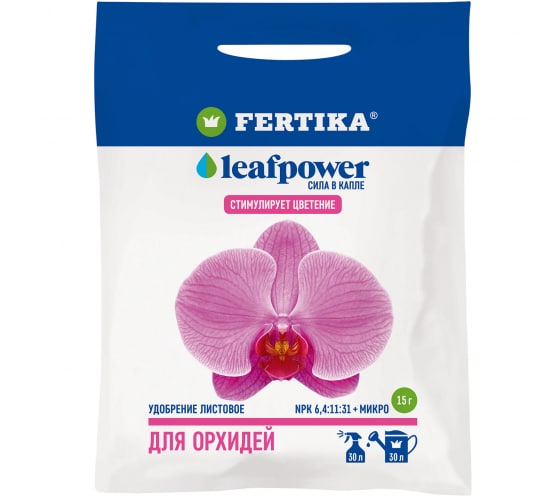 Удобрение Fertika Leaf Power ДЛЯ ОРХИДЕЙ 0.015 кг 4620005614291 - комплексное водорастворимое удобрение. Рекомендуется для подкормки разного вида орхидей. Продлевает срок цветения. Способствует увеличению количества бутонов. Микроэлементы в хелатной форме лучше усваиваются и быстрее воздействуют на растение. Не подкармливать в фазу цветения