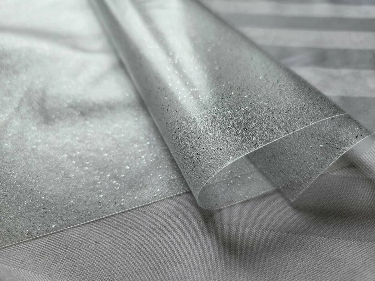 Силиконовая скатерть с блестками серебристыми на стол, клеенка, водоотталкивающая, мягкое гибкое стекло, прямоугольная, пленка