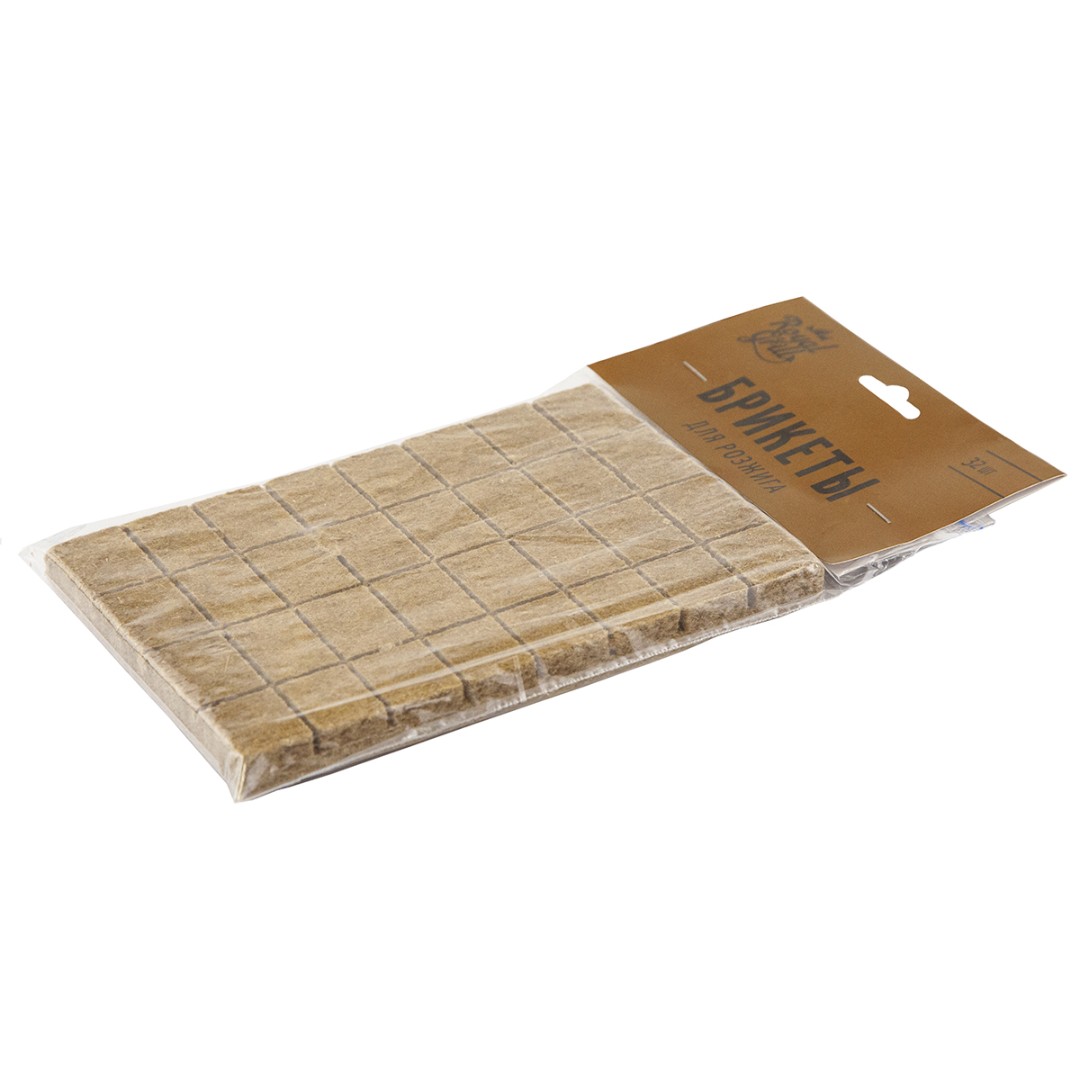Брикеты для розжига 32 кубика, ROYALGRILL, 80-144 Для разжигания угля, костров, топок, печей, мангалов и грилей. Время горения 1 кубика- 6 мин. Не боятся влаги. Состав: ДВП, смесь парафинов. Для розжига дров: 1.Положите несколько поленьев в очаг. 2.Отломите от плитки один или несколько брикетов. 3.Положите брикет между поленьями. 4.Подожгите брикет. 5.Разместите поленья сверху так, чтобы обеспечить доступ воздуха. Для розжига древесного угля: 1.Отломите от плитки 5-6 брикетов. 2.Разложите брикеты равномерно по дну мангала (барбекю, гриля и тп). 3.Подожгите брикеты. 4.Подсыпайте уголь, не закрывая доступ воздуха к пламени.
