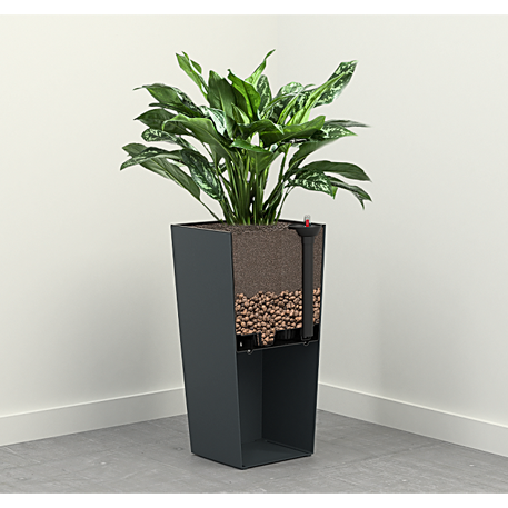 Система полива LAMELA — очень удобное и простое в использовании решение. Он идеально подходит для выращивания растений практически без ограничений. В начале ухода за растением производитель предлагает 3-месячный переходный период. За это время растение поливают традиционно, и оно адаптируется к новой системе за счет роста корней. Позже растение будет черпать воду прямо из резервуара в зависимости от своих потребностей. Между почвой и вкладышем системы полива рекомендуется положить слой инертного субстрата, например, керамзита. В системе есть индикатор, который информирует нас об уровне воды на дне картриджа и возможной необходимости его дозаправки. Водоснабжение позволяет какое-то время оставлять растение без присмотра, ведь растение само берет воду из запаса, скопившегося на дне.
