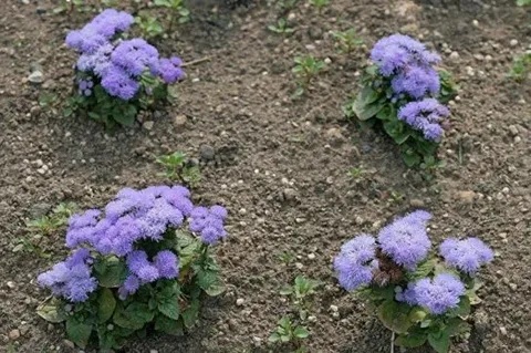 Очень красивая и длительно цветущая смесь сортов с большими пушистыми шапками соцветий. Растения из семейства Астровые, высотой 20-25 см. Цветет обильное с июня до заморозков. Соцветия мелкие, душистые, до 1-1,5 см, собраны в более крупные щитковидные соцветия до 8-10 см в поперечнике. Окраска разнообразная. Агератум засухоустойчив, светолюбив, но может расти при небольшом затенении, предпочитает легкие, умеренно плодородные почвы. Теплолюбив, заморозков не переносит. Используют на клумбах, в рабатках, миксбордерах, агератумами украшают балконы.