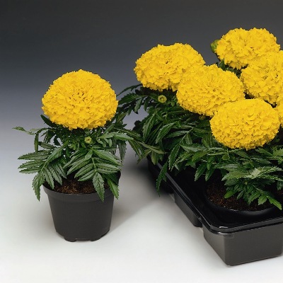 Растения генетически компактные с отличным базальным ветвлением. Высота растения – 20-30 см. Формирует многочисленные прочные цветоносы с густомахровыми крупными цветками диаметром 8-10 см. Окраска цветка лимонно-желтая. Превосходен в озеленении широких массивов и посадки в горшки, контейнеры.