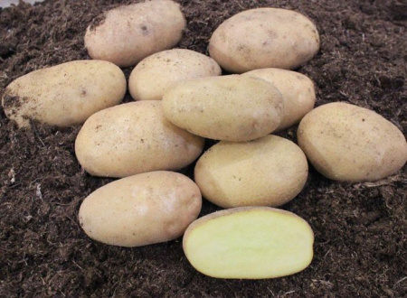 Кожура гладкая, глазки мелкие, мякоть клубня кремовая.