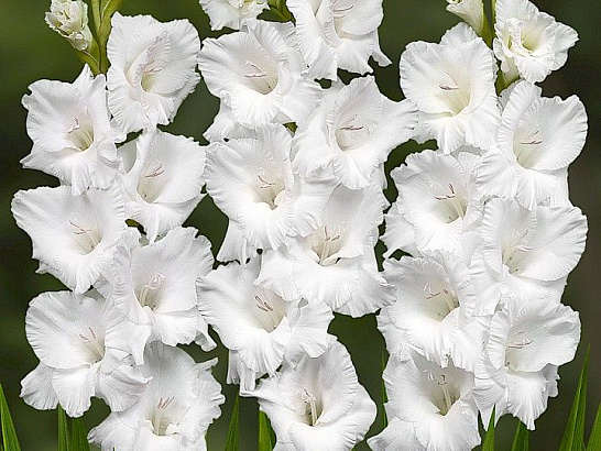 Эти цветы покоряют своей грациозностью, изысканностью, парадностью. Бутоны крупные воронкообразные слегка гофрированны на кончиках, словно белые тени густо расположенные по колосу. Гладиолус Уайт Просперити прекрасно держит свою форму, но рекомендуется подвязывать к опоре, чтобы избежать поломок стебля в ветреную погоду.