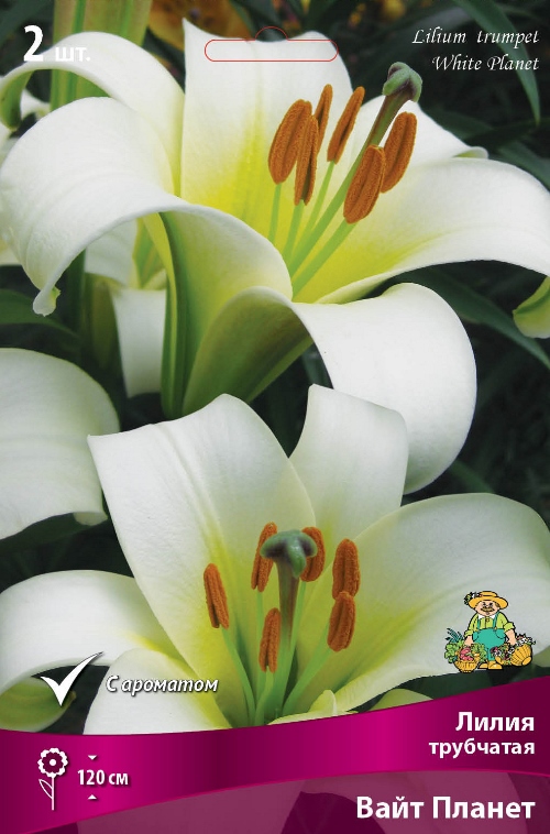 Лилия трубчатая "Вайт Планет" - очень морозостойкий гибрид. Куст высотой до 120 см. Цветки направлены вверх, белоснежные с жёлтым пятном у основания. Этот вид лилий морозостойкий, предпочитают хорошую плодородную землю с большим добавлением листового перегноя. Совершенно не подвержены вирусным болезням и очень редко страдают от грибных заболеваний.