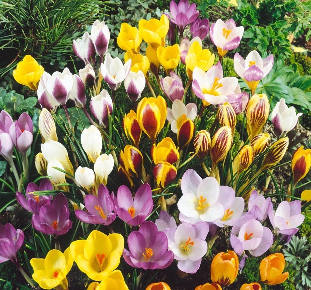 Смесь крупноцветковых крокусов. Высота растения 15 см. Цветок бокаловидной или чашевидной формы, шести-лепестковый, направленный вверх, высотой 6-10 см. Цветёт крокус в марте - апреле 7-10 дней. Сроки и период цветения могут смещаться в зависимости от погоды. Посадка - август-сентябрь. Глубина посадки 5 -10 см в зависимости от размера луковицы, расстояние между крокусами 7-10 см друг от друга. К почве особых требований нет. По освещённости крокусы предпочитают солнечные места, размножение происходит детками - дочерними клубнелуковицами.