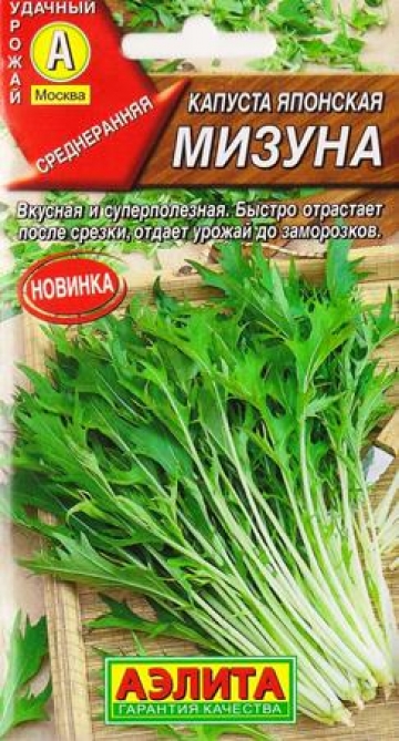 Среднеранний сорт листовой капусты. Первый сбор зелени можно проводить спустя три недели после всходов. Формирует крупные розетки массой 1-1,5 кг из 45-60 крупных листьев. Листья мизуны сочные, нежные, с пикантным слабогорчичным вкусом. Прекрасно подходят для различных салатов, бутербродов и блюд из морепродуктов. Регулярное употребление японской капусты повышает сопротивляемость организма инфекциям, препятствует развитию онкологических заболеваний, улучшает состав крови. Сорт достаточно холодо- и жаростойкий. Урожайность 6-7 кг/м2.