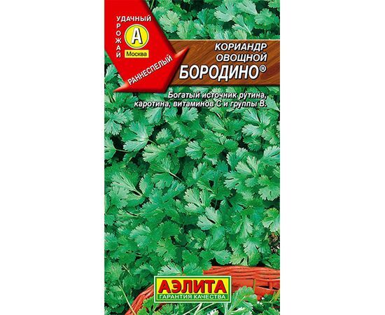 Сорт раннеспелый, период от полных всходов до уборки на зелень 30-35 дней, на специи 50-55 дней. Высота растения – 30-35 см, масса растения в технической спелости 20-25 г. Урожайность сорта 1,9-2,3 кг/м2. Кориандр (или кинза) – эфиромасличное, пряное, овощное, лекарственное и медоносное растение. Используется зелень и семена. Зелень – богатый источник рутина, каротина, витаминов С и группы В, кальция, магния и фосфора. Зелень кориандра применяется в свежем виде как приправа к мясным и овощным блюдам, ее кладут в супы, соусы, из нее готовят многообразные приправы впрок. Семена с пряным запахом и сладковатым вкусом широко используются в хлебопечении, при консервировании, в повседневной кулинарии.