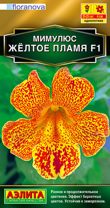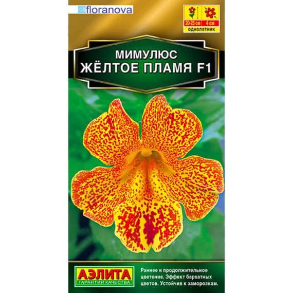 Гетерозисный гибрид с обильным цветением иностранной селекции. Ценится за компактность кустика, крупный размер цветка (4 см) и короткий период от посева до бутонизации. Растения высотой 20-25 см обильно цветут двумя волнами, первая волна – в июне-июле. В середине лета кусты обрезают. Отрастающие молодые побеги обеспечивают вторую волну цветения, обильнее и продолжительнее первой, благодаря устойчивости гибридов к заморозкам до -4°С. Мимулюсы используют для оформления затененных цветников, балконных контейнеров. Гибриды можно сохранить до следующего сезона. Для этого осенью растения пересаживают в горшки и переносят для зимовки на прохладный светлый подоконник.