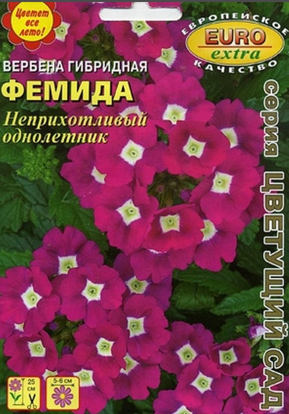 Неприхотливый, компактный однолетник. Высота растения 25 см. Диаметр цветка 5-6 см. Это уникальное растение не только украсит своими пышными соцветиями клумбы, цветники и рокарии, но также внесет приятное разнообразие в Ваш домашний садик. Миниатюрные кустики увенчаны соцветиями темно-пурпурного цвета с глазком. Вербена отлично переносит посадку в ящики, контейнеры, горшки, может применяться в любых видах ландшафтного озеленения, так как прекрасно сочетается с бархатцами, розами, ромашкой и многими другими растениями.