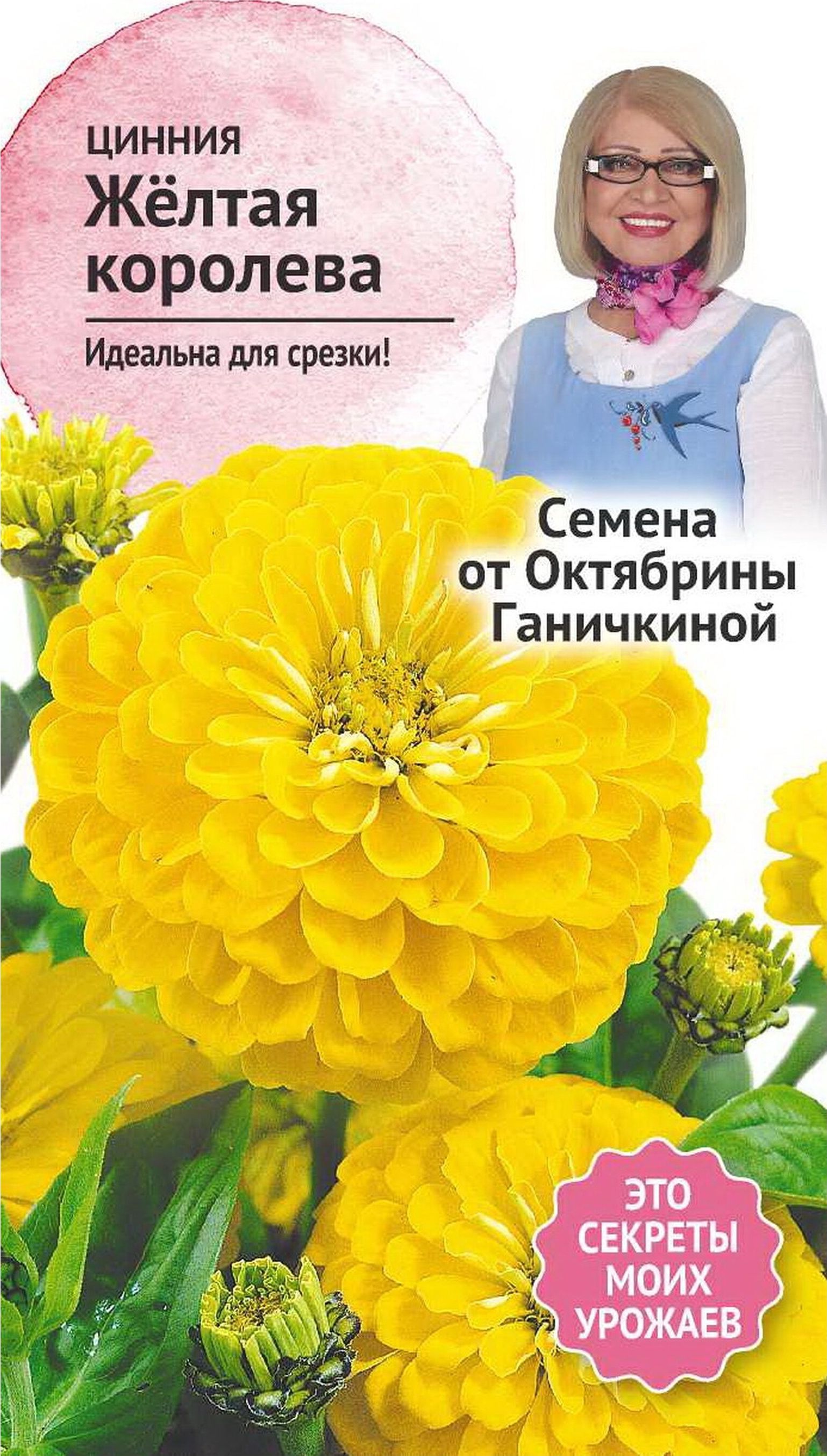 Однолетник. Растения высотой до 80 см с крупными желтыми георгиновидными соцветиями диаметром до 10 см. Циннию используют для посадки на сборные цветники, рабатки, клумбы и на срез для букетов. Агротехника: Растения светолюбивые, теплолюбивые и засухоустойчивые, не переносят заморозки. Семена высевают на рассаду в апреле или в открытый грунт в конце мая. Всходы появляются через 4 - 6 дней. В грунт рассаду высаживают в начале июня по схеме 20x30 см. Цветение наступает через 60-70 дней после появления всходов и продолжается до заморозков.