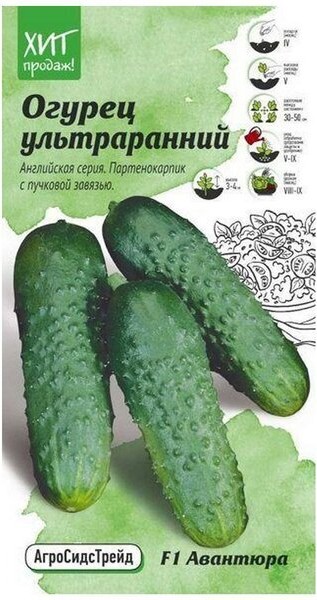 Огурец Авантюра F1 - ультраранний партенокарпический гибрид, от всходов до начала плодоношения 36-40 дней. Растение индетерминантное, слабоветвистое, с укороченными междоузлиями, женского типа цветения, в узле по 2-4 завязи. Плод цилиндрический, длиной 10-12 см, диаметром 3,5-4 см, массой 90-110 г, интенсивной темно-зеленой окраски с очень короткими, слабо заметными зелеными полосами. Поверхность плода бугорчатая, бугорки среднего размера, четкие, расположены часто, опушение белое. Консистенция хрустящая, сочная, без горечи. Вкусовые качества отличные. Урожайность – 9 кг/м2. Плоды транспортабельные, выравненные по размеру в течение всего периода выращивания. Плоды рекомендуется собирать в стадии пикуль, корнишон, зеленец. Гибрид обладает комплексной устойчивостью к заболеваниям. Универсального назначения, прекрасно подходит для консервирования. Рекомендован для выращивания в защищенном грунте (весенний и летне-осенний оборот), а также в открытом грунте.