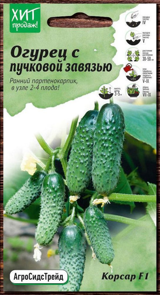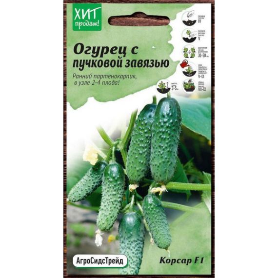 Огурец Корсар F1 - среднеранний партенокарпический гибрид огурца (40-45 дней от всходов до начала плодоношения). Рекомендуется для выращивания в весеннем и летне-осеннем обороте в остекленных и пленочных теплицах, а также в открытом грунте. Растения мощные, лист от среднего до крупного, темно-зеленый, умеренное отрастание боковых побегов. Тип цветения женский, в узле по 2-4 завязи. Зеленцы 11-13 см, диаметром 3,5-4,0 см, массой 110-130 г. Окраска плодов темно-зеленая, практически без рисунка, бугорки крупные, расположены часто. Окраска шипов белая. В жаркие месяцы форма и окраска плода сохраняются. Вкусовые качества отличные. Плоды прекрасно транспортируются на дальние расстояния. Пригоден для переработки. Гибрид высокоустойчив к кладоспориозу, настоящей мучнистой росе, вирусу огуречной мозаики, корневым гнилям и среднеустойчив к ложной мучнистой росе и вирусу желтой мозаики цуккини.