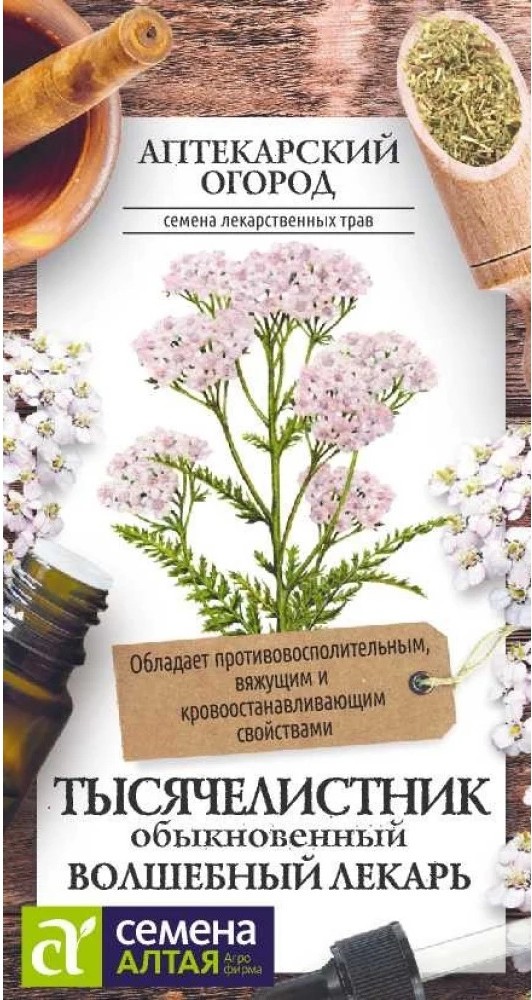Многолетнее лекарственное растение. Куст прямостоячий, высотой 70-90 см. Листья трижды перисто-рассеченные. Цветки-корзинки белые, собраны в зонтичные соцветия. В листьях и соцветиях содер-жатся алкалоиды, дубильные вещества, инулин, каротин, витамины С и К. Обладает противовоспалительным и бактерицидным действием. Применяют в виде настоев, отваров, экстрактов при различных заболеваниях желудочно-кишечного тракта, язвенной болезни и гастрите, настой действует как кровоостанавливающее, применяется при головных болях, ночных судорогах в ногах, малокровии, в виде компрессах при нарывах, гноящихся ранах.