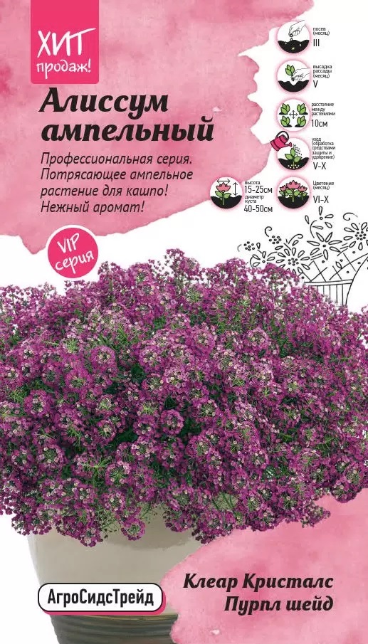 Уникальная серия Алиссума компании PanAmerican Seed отличается обильным и продолжительным цветением без дополнительной обрезки после первой волны цветения, в отличие от многих классических сортов. Высота растения варьируется от 15 до 25 см. Диаметр разросшейся кроны сформированного растения составляет 30-36 см. Форма куста – полушаровидная, размер сферы может достигать 25 см и более. Цветки мелкие, собраны в кистевидные соцветия до 5 см в диаметре, образуют сплошной цветущий ковер, отличаются нежным ароматом. Алиссум широко используется на каменистых горках, клумбах, рокариях, а также для посадки в балконные ящики. Агротехника: Алиссум - светолюбивое и засухоустойчивое растение. Семена высевают в середине апреля на рассаду или в середине мая в открытый грунт. Всходы появляются через 4-5 дней. Рассаду высаживают в мае-июне по схеме 10х10 см. Цветение наступает через 40-45 дней после появления всходов и продолжается до глубокой осени