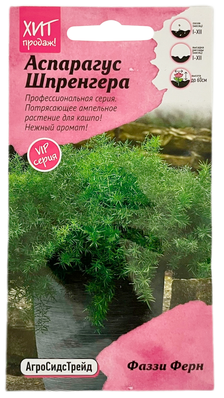 Самый популярный вид комнатных аспарагусов от ведущего мирового производителя PanAmerican Seed (США). Аспарагус Шпренгера - многолетний полукустарник для оформления интерьеров, известен также как Спаржа плотноцветковая Шпренгера. Легко выращивается и отлично подходит для комнатных и уличных условий, а также прекрасно выглядит в подвесных корзинах. Аспарагус произрастает в Восточной и Южной Африке, где растет как вечнозеленое травянистое многолетнее растение в сухих и влажных тенистых лесах и кустарниках саванн, поэтому в комнатных условиях можно выращивать как многолетнее растение. Растение светолюбиво, но выдерживает небольшое затенение. Наибольший декоративный эффект достигается при выращивании на легких и плодородных почвах. Куст размером 60–90 см. Листья линейные, блестящие, светло-зеленые. Вначале растение прямостоячее, позднее становится более каскадным с изогнутыми ветвями, покрытыми нежной, перистой листвой. Растение идеально подходит в качестве наполнителя для букетов из срезанных цветов.