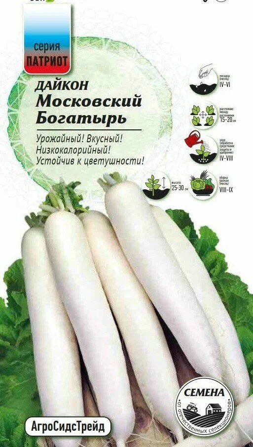 Среднеспелый отечественный сорт (от полных всходов до технической спелости корнеплодов 80-85 дней). Урожайность 16-18 кг/м2. Корнеплод цилиндрический с гладкой поверхностью, длиной 75-80 см, диаметром 6-9 см. Погружен в почву на 1/3 длины, легко выдергивается при уборке. Масса товарного корнеплода 1-1,5 кг. Мякоть сочная, белая, слабоострая на вкус, без горечи. Рекомендуется для использования в свежем виде и длительного хранения. Дайкон – ценный низкокалорийный диетический овощ, полезен для профилактики сердечно-сосудистых и простудных заболеваний.