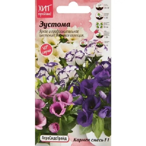 Самое модное растение! Удивительная серия кармен выведена для выращивания в горшечной культуре. Отличается компактной формой кустика – 20-25см с крупными цветками и продолжительным периодом цветения. В период цветения растение усыпано большим количеством махровых цветов, 4-6см в диаметре. Эустома серии кармен отличается пластичностью в сроках выращивания и большим разнообразием окрасок. Отличается мощной корневой системой, позволяющей растению отлично развиваться и продолжительно цвести. Очень эффектное растение, как для сада, так и для дома. В доме эустома может жить 2-3 года, в открытом грунте её выращивают как однолетнее растение. Предпочитает полутень, не переносит сквозняков.
