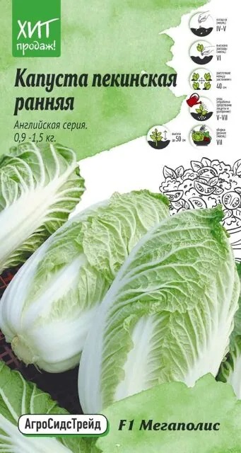 Среднеранний гибрид, 48-52 дня от высадки рассады в грунт до сбора урожая. Розетка вертикальная, среднего размера. Лист от среднего размера до крупного, сильнопузырчатый, глянцевый, жилка плоская, широкая, опушение листа очень слабое. Кочан очень крупный, бочковидной формы, упругий, плотный, хорошо закрытый, массой 0,9-1,5 кг, с хорошей внутренней структурой и отличными вкусовыми качествами. Урожайность – 6-7,5 кг/м2. Кочаны отлично транспортируются и долго сохраняют высокие товарные качества. Гибрид идеально подходит для упаковки, благодаря тяжелым, крупным кочанам. Устойчив к фузариозному увяданию. Предназначен для потребления в свежем виде, хранения и транспортировки. Рекомендован для выращивания в открытом грунте весной и осенью. Агротехника: Капуста пекинская – холодостойкая, свето- и влаголюбивая культура, требующая плодородных хорошо окультуренных почв. Посев на рассаду проводят в теплицах или пленочных укрытиях в конце апреля – начале мая. Через 30 дней после появления всходов (фаза 4-5-ти настоящих л
