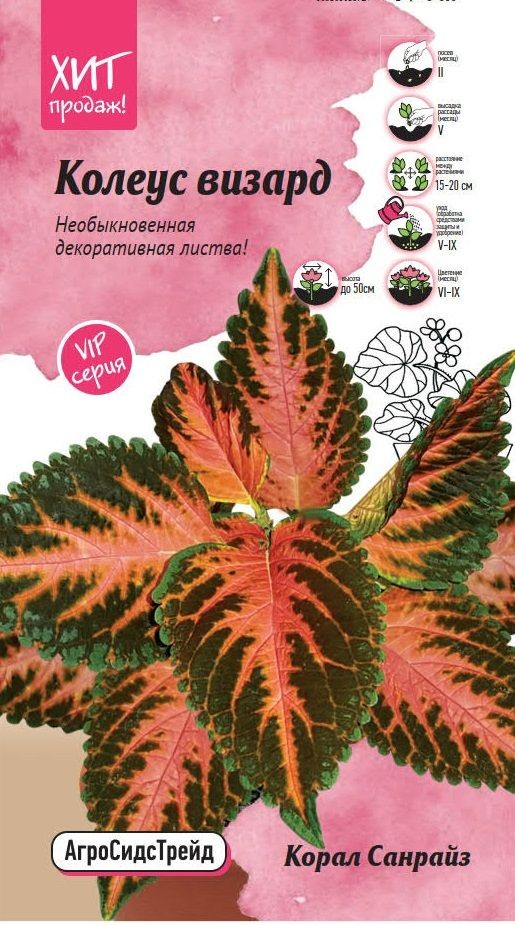 Экзотическое растение с декоративной листвой! Колеус серии Wizard® с самой эффектной окраской и текстурой листьев от компании PanAmerican Seed (США). Исключительно легкое в уходе, но при этом очень красивое растение с яркими листьями и сочными стеблями для дома и сада. Формирует кустик высотой 25-30 см с хорошо разветвленными и густооблиственными побегами. Благодаря отличному кущению, растение быстро набирает объем, сохраняя компактный габитус в процессе роста. Цветки мелкие, невзрачные, собраны в колосовидное соцветие. Вся удивительная красота листьев колеуса подобной окраски проявляется в полной мере, если высадить его в солнечном месте или в ажурной полутени. Идеально разместить его так, чтобы жаркие лучи полуденного солнца не попадали на растение. В целом этот сорт хорошо чувствует себя на солнце, с легкостью переносит высокие температуры, терпимо относится к невысокой влажности почвы. Колеус универсален и одинаково хорош как в монопосадках, так и в группе с другими цветами, как в кашпо, так и в клумбах,