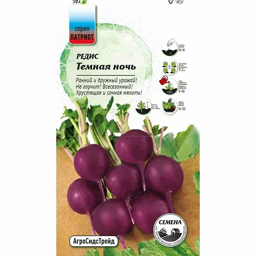 Кто опробовал этот сорт редиса, тот вряд ли когда-либо откажется от его выращивания. Быстро созревающий (раннеспелый) корнеплод совершенно оригинальный по своему внешнему виду: он тёмно-фиолетовый, округлой формы и достаточно крупный – 3-4 см в диаметре, а также безумно вкусный и, наделенный чудесными товарными качествами, прекрасно хранится, так что вполне может составить достойную конкуренцию любому престижному сорту. Редис Тёмная ночь считается всесезонным. Если в вашей семье любят этот овощ, возделывать его вы можете всё лето, и опасаться, что растение уйдет в стрелку не стоит, так как этого не произойдёт.