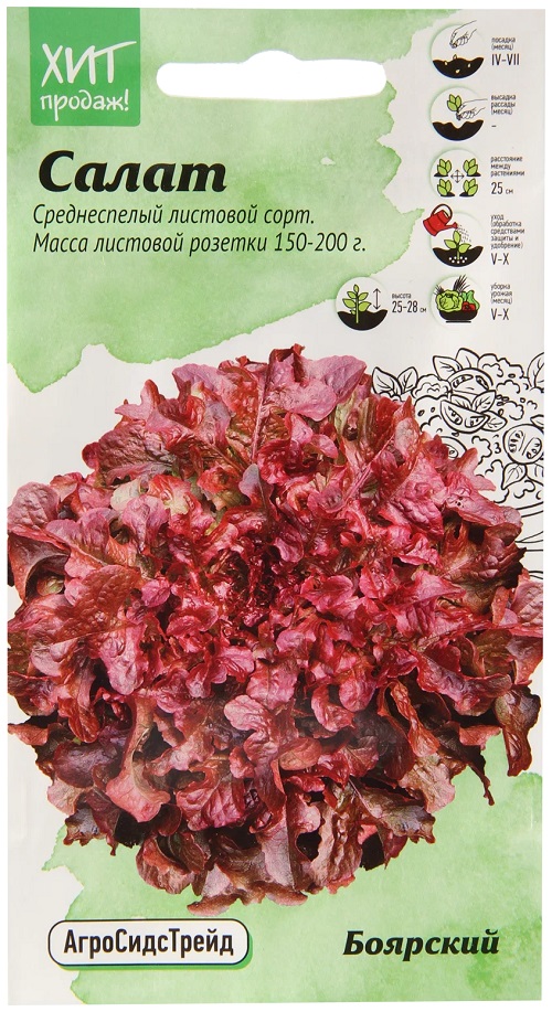 Салат БоярскийХолодостойкий среднеспелый (50-60 дней) листовой сорт с красивой рыхлой розеткой, высотой 25-28 см. Листья декоративные, хрустящие, бордово-коричневого цвета, напоминают — листья дуба, формируют — розетку диаметром 25-30 см, массой 150-200 г. Листья имеют приятный нежный вкус с тонким ореховым привкусом.Средняя урожайность 3,5-4,0 кг/м2. Ценность сорта: 6 холодостойкость, отличные вкусовые качества, устойчивость к цветушности и болезням. Способен отрастать после частичной обрезки.
