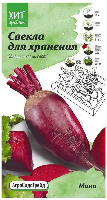 Свекла монаСреднеранний одноростковый сорт, от всходов до технической спелости 105 дней. Корнеплод цилиндрический, красный, массой 200-330 г головка средняя, слабоопробковевшая. Мякоть темно-красная, нежная, сочная, со слабовыраженными кольцами. Вкусовые качества отличные. Корнеплод не полностью погружен в почву, хорошо выдергивается. Урожайность – 5,5-5,8 кг/м2. Сорт отличается ранним формированием товарной продукции, стабильной и высокой урожайностью, отличными вкусовыми качествами. Не требует прореживания. Рекомендуется для хранения, консервирования и выращивания на пучковую продукцию
