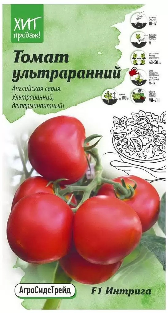 Ультраранний детерминантный гибрид, период от всходов до сбора урожая 75-80 дней. Растение сильное, хорошо облиственное, формирует кисть с 8-10-ю плодами. Плод округлый, плотный, интенсивно красного цвета, массой 120-140 г. Вкусовые качества высокие. Урожайность - 6 кг/м2. Гибрид устойчив к основным заболеваниям, неприхотлив, прекрасно завязывает плоды в независимости от условий выращивания. Характеризуется очень ранними урожаями, плоды транспортабельные, выровненные, отличного вкуса. Используется для свежего потребления и всех видов переработки. Рекомендован для выращивания в пленочных теплицах и открытом грунте.