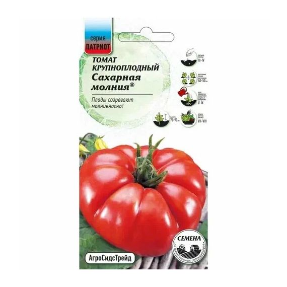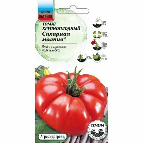 Семена Томат Сахарная молния крупноплодный. Стабильно урожайный, раннеспелый, высокорослый, крупноплодный сорт для выращивания в открытом и закрытом грунте. Плоды округло-плоские, красные, гладкие, плотные, сочные, мясистые, сахаристые на изломе.Ценность сорта: высокая урожайность. Отличные вкусовые качества, хорошая завязываемость плодов при неблагоприятных погодных условиях, устойчивость к болезням. Используется для приготовления диетических и деликатесных салатов, соков, засолки.
