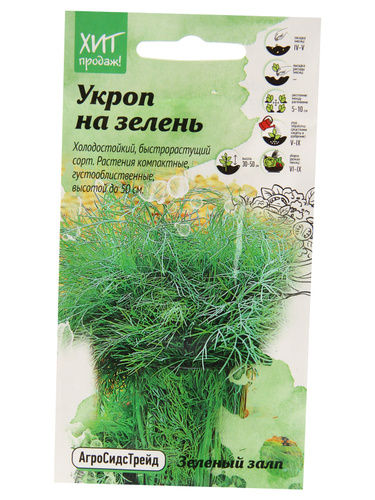 Укроп зеленый залпПозднеспелый (55-60 дней до уборки на зелень), холодостойкий, сильно растущий сорт. Растения компактные, густо облиственные, высотой 30-50 см. В фазу цветения высота растений 100-150 см. Листья сизо-зеленые, сильно рассеченные, сочные, нежные, ароматные. Масса растения при уборке на зелень 35-50 г, на специи – 110-120 г. Ценность сорта: замедленное стеблеобразование, длительный период хозяйственной годности на зелень, сильный пряный аромат, устойчивость к болезням.