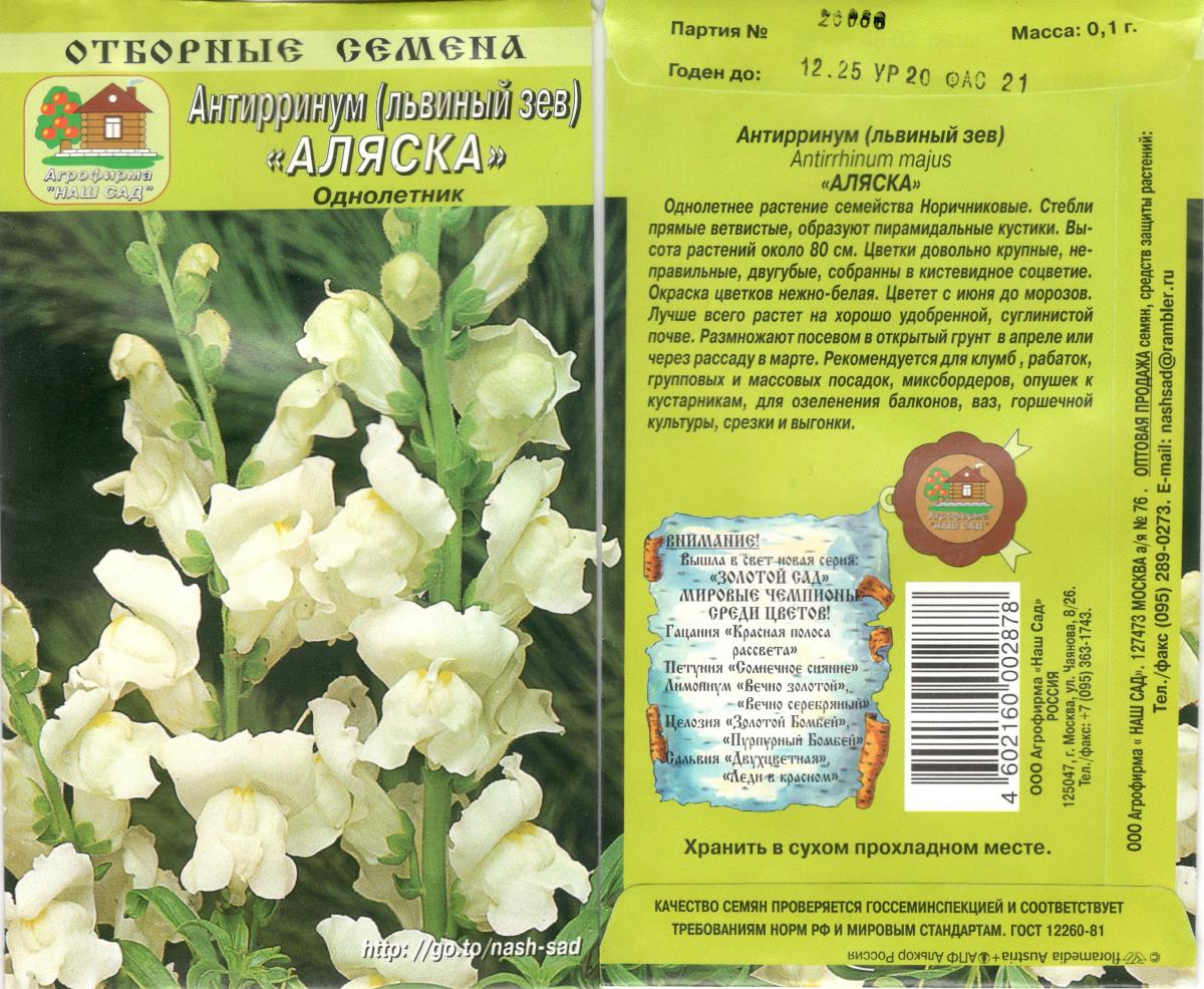 Великолепный крупноцветковый срезочный сорт. Декоративное однолетнее растение из семейства Норичниковые высотой 70-90 см. Цветет с конца июня до поздних заморозков. Цветки собраны в кистевидные соцветия снежно-белой окраски. Холодостоек, светолюбив, к почвам нетребователен, в засушливый период нуждается в поливе. Выращивают рассадным способом. Посев проводят с начала марта до середины апреля. Всходы появляются через 8-12 дней. Рассаду высаживают во второй половине мая с расстоянием между растениями 35-40 см. Используется для групповых посадок и цветников, а также для получения высококачественной срезки (львиный зев стоит в воде до двух недель).