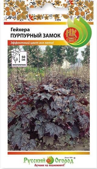 Гейхера Пурпурный Замок уже давно полюбилась всем садоводам. Ведь это отличный способ быстро сделать ваши посадки красивыми, причём с ранней весны до поздней осени! Её листья очень тёмные, бордово-пурпурные, хорошо смотрятся на солнечной стороне, играя множеством красных оттенков. Цветки же окрашены в чистейше-белый оттенок, придающий интересный контраст. Это растение можно посадить в белый цветник, красный, розовый или фиолетовый. Можно украсить небольшой группой Пурпурного Замка пространство рядом с домом (особенно если его стены имеют красные оттенки или же насыщенно жёлтые).
