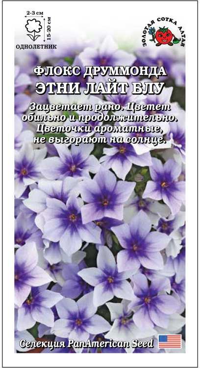 Ранний, обильно и продолжительно цветущий флокс для посадки в цветники и украшения кашпо в саду и на балконе. Растения генетически компактные, отлично ветвятся, цветоносы прямостоячие, крепкие. Многочисленные цветочки оригинального голубого цвета с фиолетово-синим центром, собранные в крупные соцветия, не выгорают на солнце и долго сохраняются в букетах. Аромат приятный, нежный.