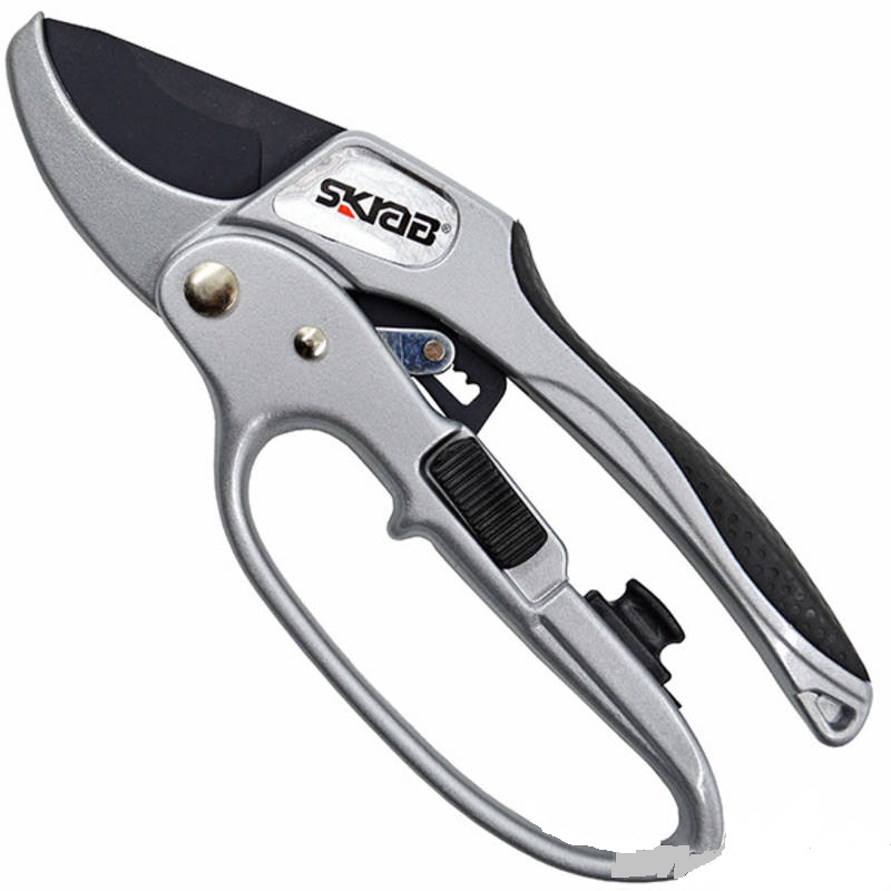 Лезвие секатора выполнено из японской высокоуглеродистой стали SK-5 с тефлоновым покрытием PTFE, которое уменьшае коэффициент трения, предотвращает прилипание и защищает от коррозии. При обрезке веток рекомендуется производить рез под углом 45 градусов. Инструмент подходит для работы с ветками толщиной до 20мм. Секатор SKRAB 28169 оборудован храповым механизмом, предполагающим поэтапный срез веток (три-четыре нажатия) снижающим прилагаемое усилие на 50%. Инструмент прост в использовании, дает возможность подрезать деревья и кустарники, прилагая минимум физических усилий. Данная модель секатора позволяет получить точный и ровный срез, не расщепляя растительные волокна. В комплекте масленка для ухода за лезвием.