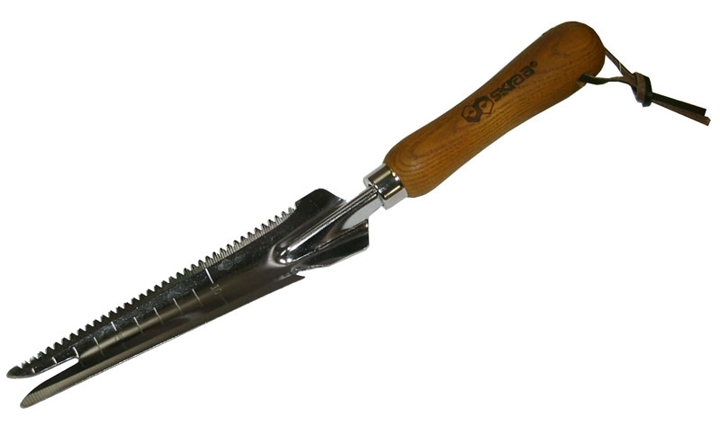Удалитель сорняков - совок узкий (нож - корнеудалитель) универсальный 330 мм HCS сталь с деревянной ручкой SKRAB 28402 выполнен из высокоуглеродистой стали HCS, имеет антикоррозийное покрытие, шкалу глубины 10 см, удобную деревянную ручку из твердых пород дерева. Ручка покрыта лаком для защиты от грязи и воды. Ручка расположена под углом 30 градусов к основанию совка, имеет отверстие для подвеса и шнурок. Корнеудалитель садовый 28402 SKRAB очень простое и удобное в работе приспособление, которое помогает садоводу легко избавиться от нежелательных сорняков, в том числе одуванчиков, на грядке, клумбе, цветнике без трудоёмкого перекапывания земли. Проникающее на 20 см лезвие ножа захватывает корень сорняка, после чего он вытаскивается из земли. Дополнительное удобство в работе с тяжелым грунтом и дерном дают заточенные края лезвия - нож и пила. Удалитель сорняков 28402 SKRAB совмещает в себе 6 функций (6 в 1): совок, нож, пила, открывашка, корнеудалитель, глубиномер. Нож - совок так же подходит для рыхления зем
