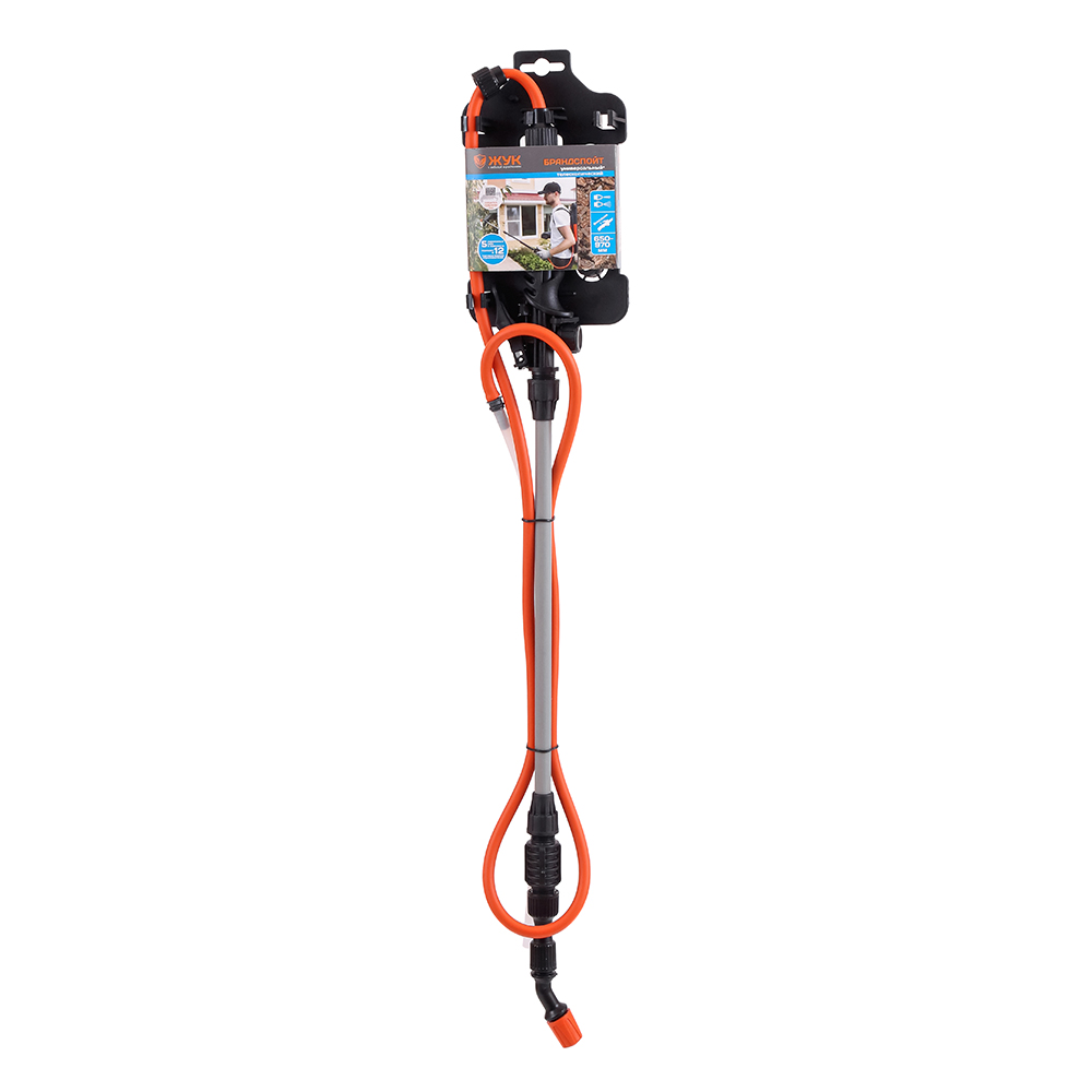 Распылитель ЖУК предназначен для подсоединения к опрыскивателям. С помощью него происходит мелкокапельное распыление эмульсий и ядохимикатов, предотвращающих заболевания растений и защищающих от вредителей. Брандспойт состоит из 2 стеклопластиковых трубок длиной 650 мм и 970 мм, ручки, шланга и распылительного узла на конце. Тип распыления регулируется от струи до мелких брызг.