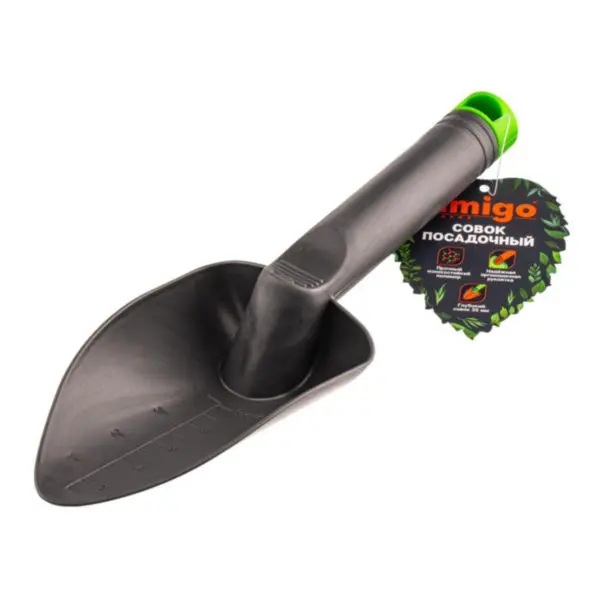 Совок посадочный подходит для быстрой пересыпки грунта. Оснащен шкалой измерения глубины посадки. Прочный полимер не вступает в реакцию с химическими элементами почвы и удобрений. Удобная рукоятка с эргономичным упором для пальца. Отверстие для подвеса.