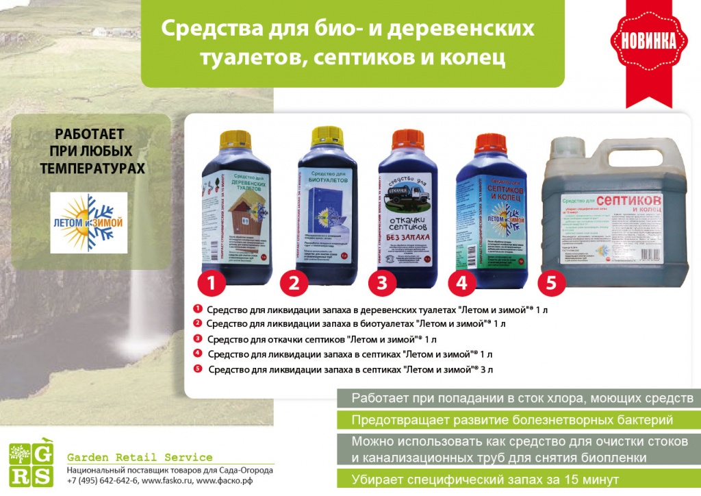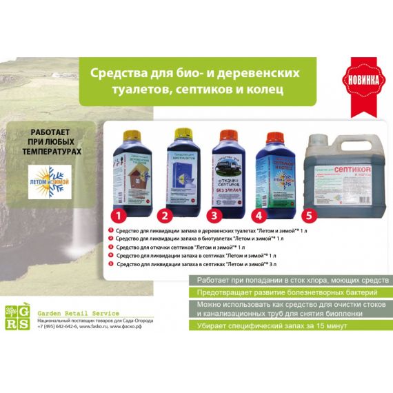 Эффективное средство для септиков. Убирает специфический запах за 15 минут! Работает при попадании в сток хлора, моющих средств. Предотвращает развитие болезнетворных бактерий. Одинаково хорошо работает как летом, так и зимой.